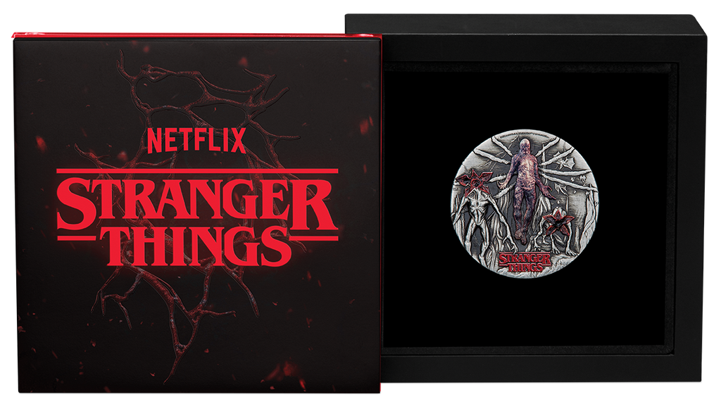 The coin's coloured reverse features the mysterious world of Hawkins. The coin's upper half showcases Mlke, Dustin, Lcas, and Eleven on an adventurous bike ride, while the lower half features the eerie Upside own, featuring Wland the ominous presence of the Demogorgon. Included in the design is the inscription "ON NOV 6,1983 THE WORLD TURNED UPSIDE DOWN. FOREVER.", along with the "STRANGER THINGS" logo and The Perth Mint's 'p" mintmark.