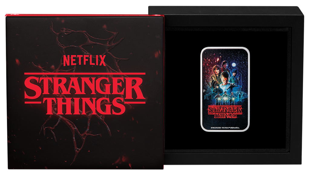 The coin’s coloured reverse pays tribute to the iconic Season 1 poster. The design features each of the main characters including Mike, Dustin, Lucas and Eleven, and the rest of the Hawkins crew. The eerie background portrays the mysterious town of Hawkins. The design includes the 'STRANGER THINGS' logo along with The Perth Mint’s ‘P’ mintmark.