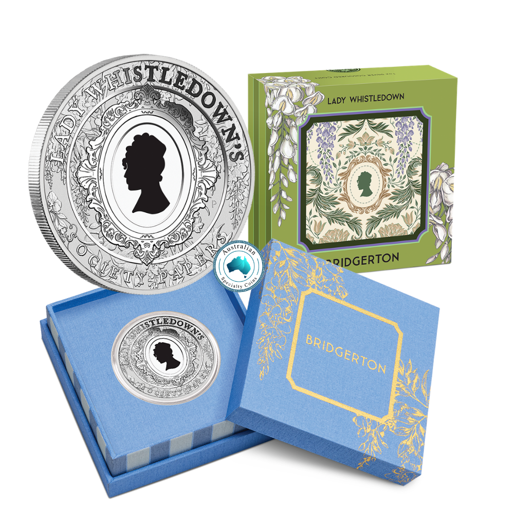 The coin’s reverse portrays an illustrated portrait of Lady Whistledown, framed by an ornate Regency-style border and encircled with the inscription “LADY WHISTLEDOWN’S SOCIETY PAPERS”. The design also includes The Perth Mint’s ‘P’ mintmark.