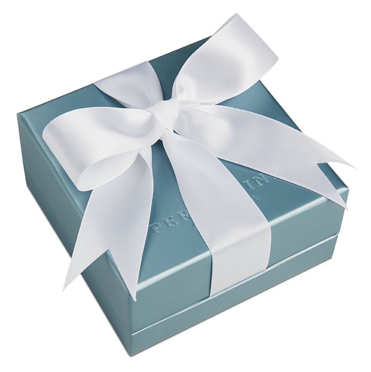 The coin is housed in a classic display case with a clear lid. Packaged in a gift box with a bow, each coin is