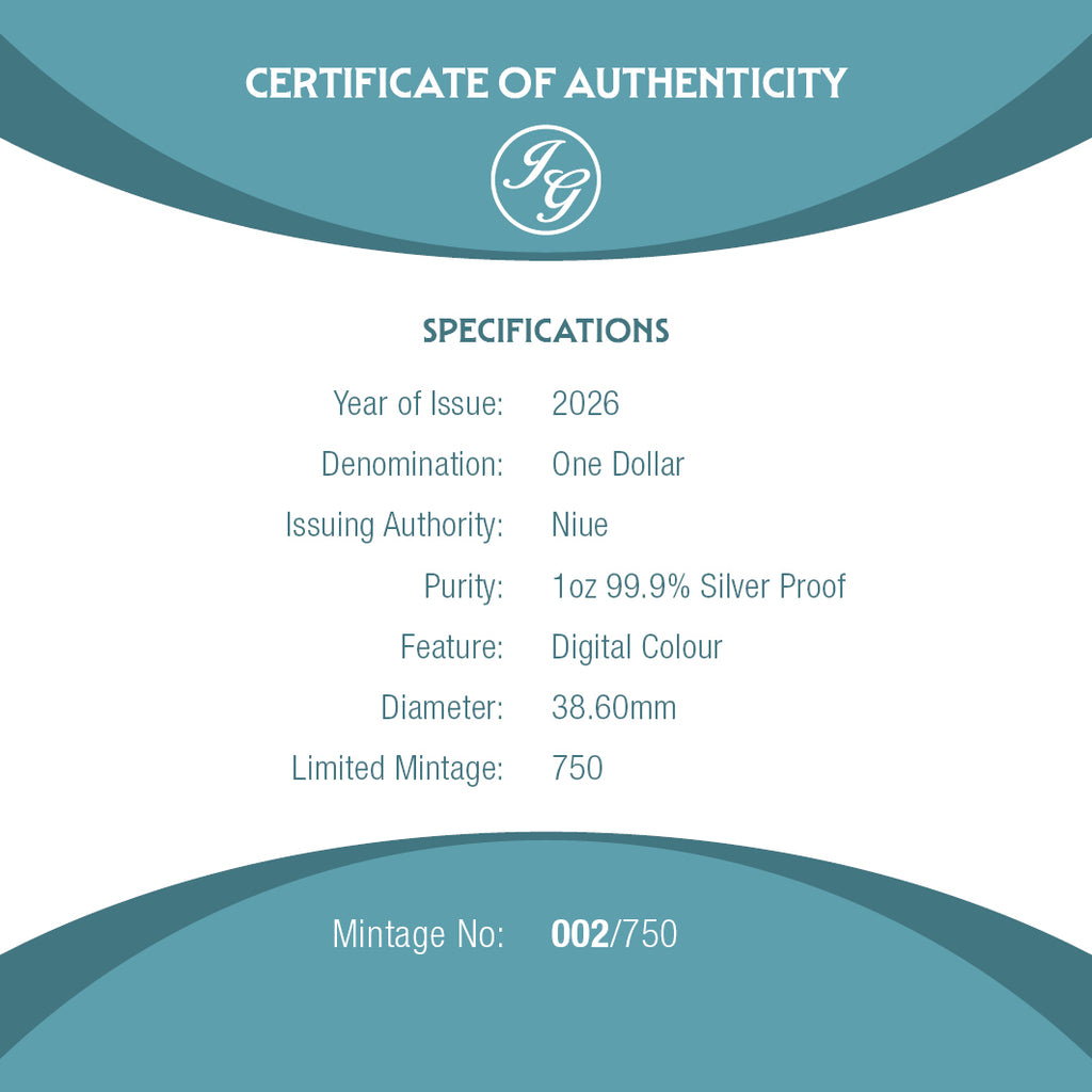• Official Niue legal tender - spans 38.60mm in diameter.
