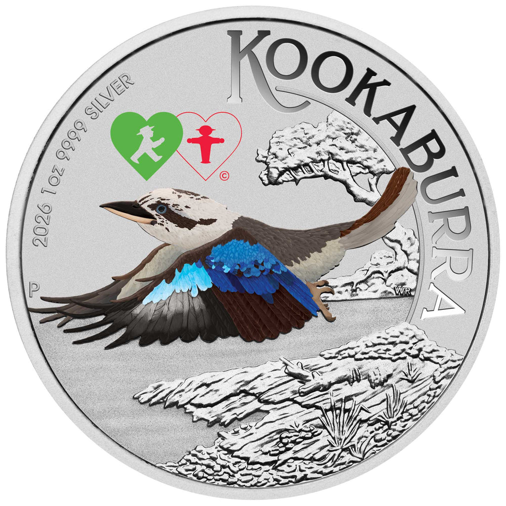 The coin’s coloured reverse portrays the famous bush bird in flight over a river, framed by lush trees and rugged rocks. The design features a privy mark depicting red and green Ampelmännchen, honouring the Berlin cult brand featuring traffic light men designed in East Germany during the 1960s. Included in the design is the inscription ‘KOOKABURRA’, along with The Perth Mint’s ‘P’ mintmark, and the coin’s weight, purity, and 2026 year-date.