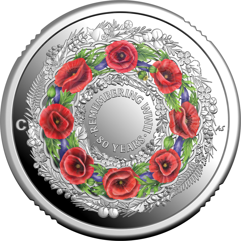In honour of the courageous Australians who served in the Second World War, the Royal Australian Mint presents this 2025 $2 C Mintmark Coloured Silver Proof Coin. The coin features a wreath of red poppies an enduring symbol of remembrance in Australia and other Commonwealth nations.